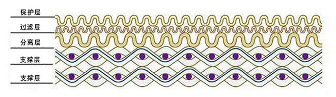 金屬濾芯所采用的復合網(wǎng)一般分為五層結構,分別為保護層、過濾層、分離層、支撐層四部分組成,燒結網(wǎng)材料易于成型、加工和焊接,制作方便。既有均勻穩(wěn)定的過濾精度又有較高的強度與剛度,對抗壓強度 要求高及過濾粒度要求均一的場合是一種理想的過濾材料。過濾原理為表層過濾,網(wǎng)孔孔道光滑,具有優(yōu)異的反洗再生性能,可以反復長期使用,非常適合連續(xù)化與自動化操作。
