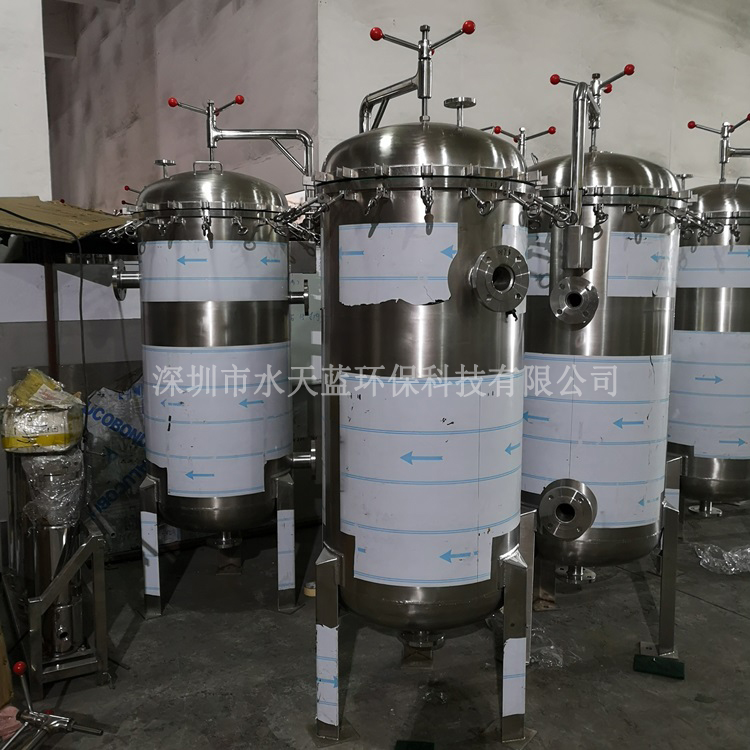 多袋式過濾器是一種正壓式過濾裝置,主要由過濾筒體、過濾筒蓋和快開器構、不銹鋼濾袋加強網等主要部件組成,濾液有過濾器外殼的旁側入口管流入濾袋,濾袋本身是裝置在加強網籃內,液體滲透過所需要精度等級的過濾袋即能獲得合格的濾液,雜質顆粒被攔截到濾袋內,過濾基本無物料消耗。