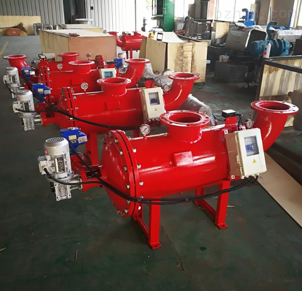 當壓差值達到預設值時,此時的過濾器將開始自動清洗:打開設備排污閥,主管組件的水力馬達室和水力缸釋放出壓力將存留在罐體中的水排出。此時水力馬達室和吸污管中的壓力大幅下降,通過負壓作用,吸嘴可以吸取細濾網內壁的污染雜質,由水力馬達流入水力馬達室,之后由排污閥排出,形成一個吸污過程。
